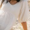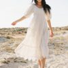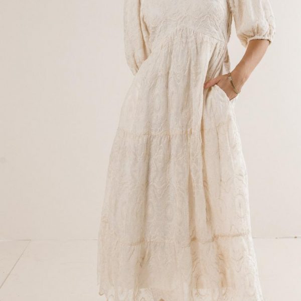 Short Puffed Sleeves Elastic Cuff and Shoulders V Neckline Fully Lined Two Hand Pockets Back Elastic Waist Tiered on Skirt Floral Embroidered Lace Material 100% Polyester Hand Wash, Lay Flat to Dry or Dry Clean The Kay Embroidered Dress in Natural is the midi you’ve been looking for your whole life. This elegant number can be styled formally or casually with little effort. We love to pair this dress with a pair of sneakers and a denim vest. Model Info Height: 5’7” Wearing Size: Small Measurements: Bust: 33″, Waist: 27″, Length: 48.5″
