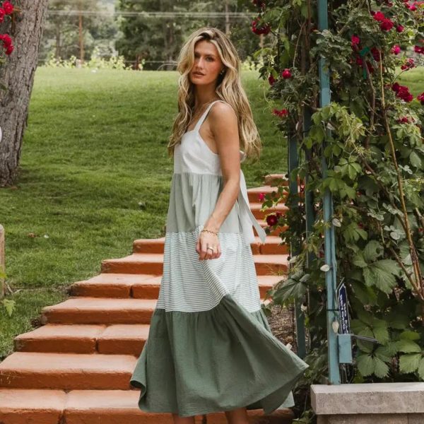 Fixed Shoulder Straps Square Neckline Back Tie Detail Alternating Striped Tiers Mini Length Lining Non Stretch Material Two Hand Pockets Self: 50% Cotton, 50% Polyester Lining: 100% Polyester Hand Wash Cold, Hang Dry  Model Info Height: 5’7″ Wearing Size: Small
