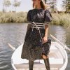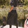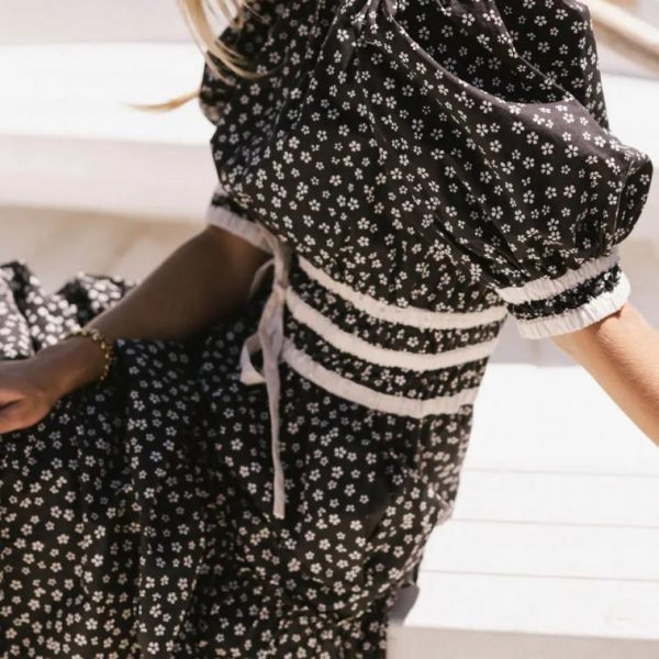 Round Neckline Elastic Waist with Faux Tie Short Puff Sleeve, Elastic Cuffs Contrast Trim Two Tiered Skirt Lined, Except for Sleeves Zipper, Hook and Eye Back Closure Non Stretch Material Self, Contrast: 100% Cotton Lining: 70% Polyester, 30% Cotton Model Info Height: 5’7″ Wearing Size: X-Small