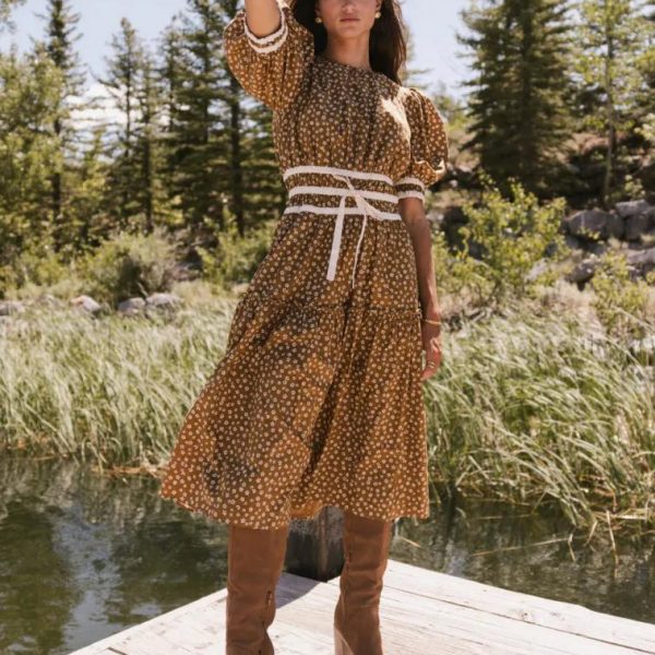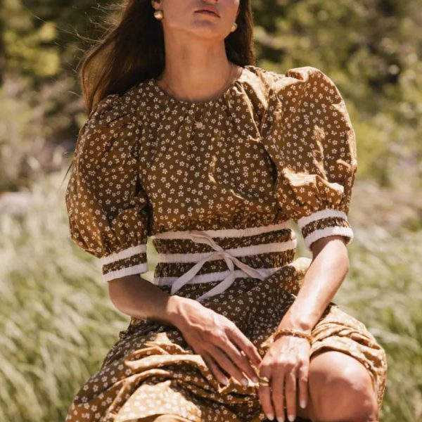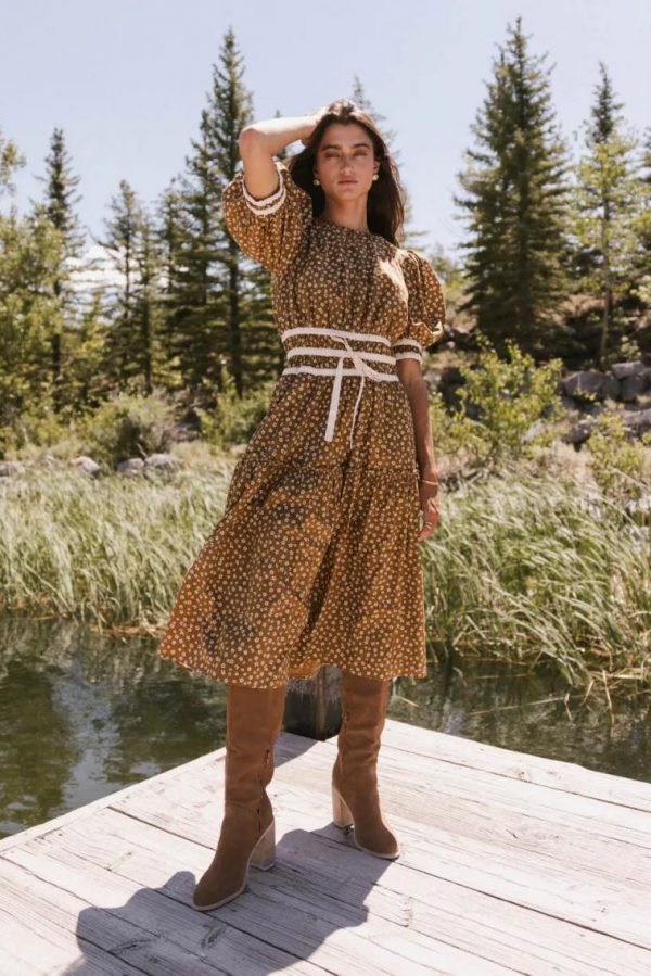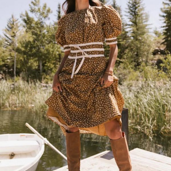 Round Neckline Elastic Waist with Faux Tie Short Puff Sleeve, Elastic Cuffs Contrast Trim Two Tiered Skirt Lined, Except for Sleeves Zipper, Hook and Eye Back Closure Non Stretch Material Self, Contrast: 100% Cotton Lining: 70% Polyester, 30% Cotton Model Info Height: 5’7″ Wearing Size: X-Small