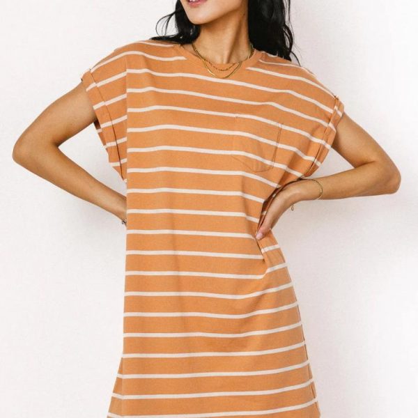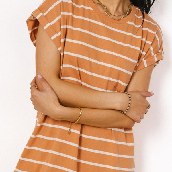 Crew Neckline Horizontal Stripes Rolled Cap Sleeves Chest Pocket Back Seam Detail Stretchy Material Boxy Fit 100% Cotton Hand Wash Cold, Dry Flat  Keep things casual and comfortable in the Kennedy Striped T-Shirt Dress in Rust. This stretchy midi was made so that you can be cozy on busy days full of errands. Pair with a low profile sneaker. Model Info  Height: 5’8″  Wearing Size: Small