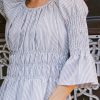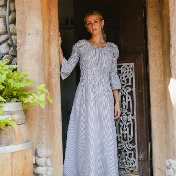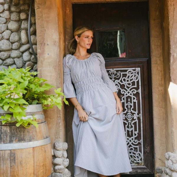 Round Neckline Smocked Waist Smocked 3/4 Sleeves Back Zipper, Hook and Eye Closure Two Hand Pockets Fully Lined Shell: 55% Polyester, 45% Viscose Lining: 100% Cotton Machine Wash Cold, Hang Dry Model Info Height: 5’7″ Wearing Size: X-Small