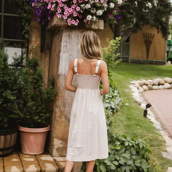 Sweetheart Neckline Eleven Decorative Buttons Adjustable Straps Smocked Bodice Back Two Hand Pockets Contrast Dark Stitching Self: 100% Cotton Lining: 100% Polyester Hand Wash Cold, Hang Dry Model Info Height: 5’7″ Wearing Size: Small