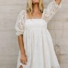 Square Neckline Puff Sleeves with Elastic Cuffs and Shoulders Back Zipper Closure Lined, Except for Sleeves Self: 50% Cotton, 50% Polyester; Lining: 95% Polyester, 5% Spandex Hand Wash Cold, Line Dry Model Info Height: 5’7″ Wearing Size: Small