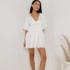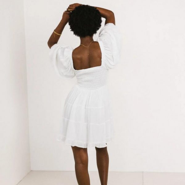 V-Neck Puff Sleeves with Elastic Cuffs and Shoulders Adjustable Front Tie Smocked Waist and Back Tiered Skirt Lined Skirt Self: 100% Rayon; Lining: 100% Rayon Dry Clean Only Model Info Height: 5’8″ Wearing Size: Small Measurements: Bust: 33″, Waist: 26-30″, Length: 32″ **For more specific information on the product, please feel free to email us at webteam@ bohme