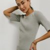 Round Neckline Short Sleeves Stretch Ribbed Material 8″ Back Slit 65% Cotton, 30% Polyester, 5% Spandex Machine Wash Cold, Line Dry Model Info Height: 5’8″ Wearing Size: Small Measurements: Bust: 29″, Waist: 25″, Length: 49″ **For more specific information on the product, please feel free to email us at webteam@ bohme