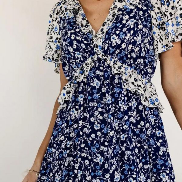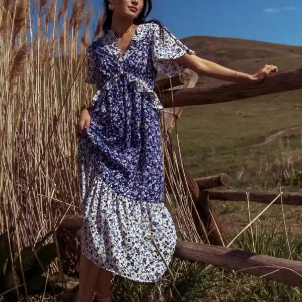 V Neckline with Contrast Ruffle Collar Short Butterfly Sleeves Elastic Waist with Contrast Ruffle Two Hand Pockets Floral Pattern Contrast Tiered Skirt Slightly See Through 100% Polyester Hand Wash Cold, Hang Dry  Ditsy florals are hot this spring and the Maisey Floral Midi Dress is one of our favorites. This fluttery dress is the perfect addition to any flower lover’s wardrobe. Style it with some sandals and put your hair up to let these ruffle shine! Model Info  Height: 5’7″  Wearing Size: Small