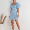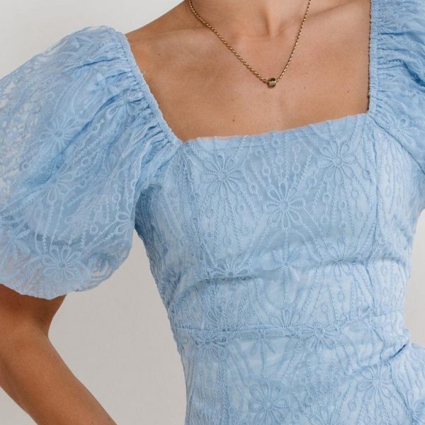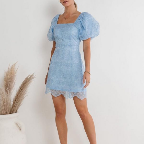 Floral Stitch Lace Pattern Square Neck Hidden 11″ Side Zipper Closure Scalloped Hem Short Puff Sleeves with Elastic Cuffs and Shoulders Lined Shell: 40% Nylon, 40% Cotton, 20% Rayon; Lining: 100% Polyester Hand Wash Cold, Lay Flat to Dry  Perfect for a girl on the move, the Maye Lace Mini Dress in Blue is stunning. This dress is complimented best by your favorite heels, a hand bag and some Y2k sunnies. Model Info  Height: 5’7″  Wearing Size: Small  Measurements: Bust: 34″, Waist: 28″, Length: 37″  **For more specific information on the product, please feel free to email us at webteam@ bohme