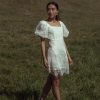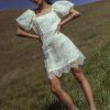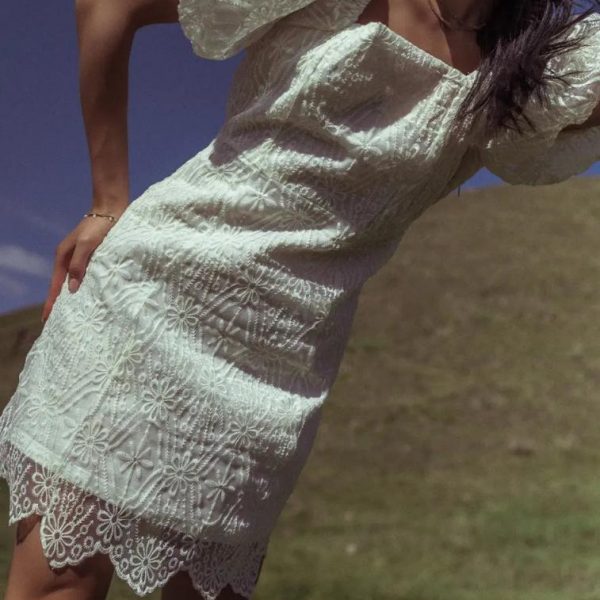 Floral Stitch Lace Pattern Square Neck Hidden 11″ Side Zipper Closure Scalloped Hem Short Puff Sleeves with Elastic Cuffs and Shoulders Lined Shell: 40% Nylon, 40% Cotton, 20% Rayon; Lining: 100% Polyester Hand Wash Cold, Lay Flat to Dry The Maye Lace Mini Dress in White is a main character. Getting ready is easy– Just add accessories. This trendy number is perfect from dinner dates, to dances. Model Info Height: 5’8″ Wearing Size: Small Measurements: Bust: 34″, Waist: 28″, Length: 37″ **For more specific information on the product, please feel free to email us at webteam@ bohme