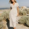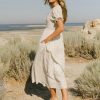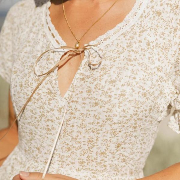 Round Neckline with Notch Lace and Ribbon Trim Ribbon Tie Detail Elastic Waistband Short Batwing Sleeve Elastic Sleeve Cuff Unlined Bodice, Lined Skirt Two Hand Pockets Self: 100% Cotton Lining: 100% Polyester Hand Wash Cold, Lay Flat to Dry Model Info Height: 5’7″ Wearing Size: X-Small