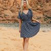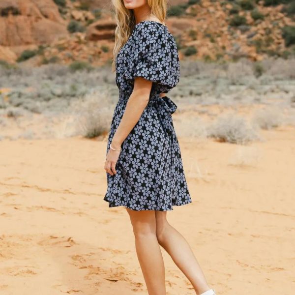 V Neckline with Snap Button Closure Short Sleeves with Elastic Cuffs Elastic Waist Waist Tie Detail Lined Self: 96% Polyester, 4% Spandex; Lining: 100% Rayon Hand Wash Cold, Lay Flat to Dry Model Info Height: 5’7″ Wearing Size: Small Measurements: Bust: 29″, Waist: 26″-28″, Length: 35.5″ **For more specific information on the product, please feel free to email us at webteam@ bohme