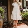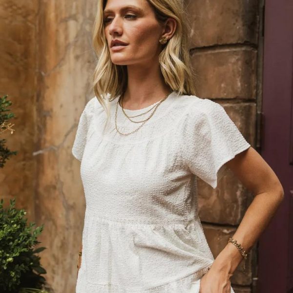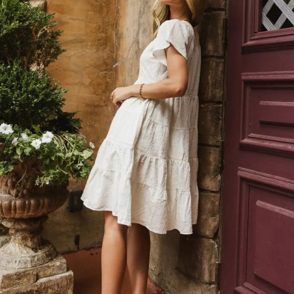 Round Neckline Short Sleeves Textured Dress Lace Detail Back Keyhole Closure Two Hand Pockets Tiered Lined Self: 97% Polyester, 3% Spandex; Lining: 100% Polyester Hand Wash Cold, Lay Flat to Dry Model Info Height: 5’7” Wearing Size: Small