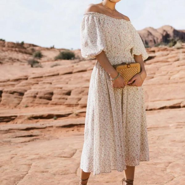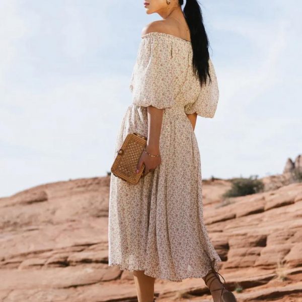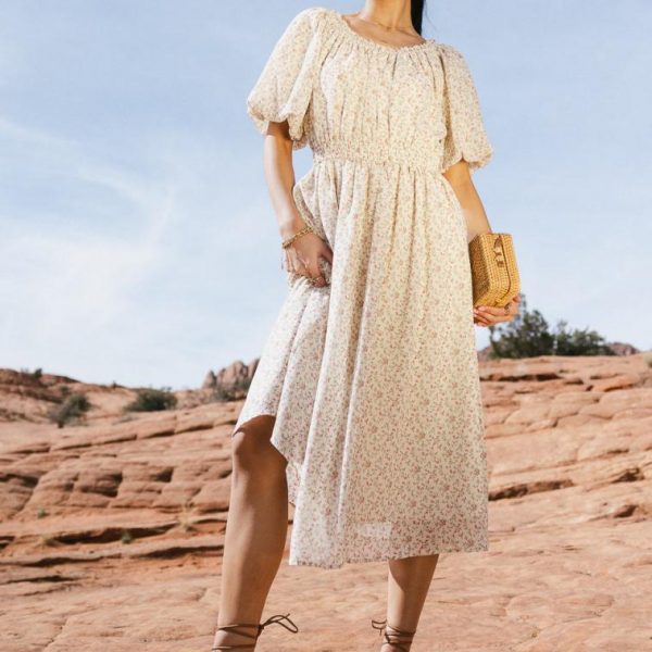 Round Neckline Short Sleeves with Elastic Cuffs Elastic Waist Lined Ditsy Floral Print Chiffon Material 100% Polyester Hand Wash Cold, Line Dry Model Info Height: 5’8″ Wearing Size: Small Measurements: Bust: 37″, Waist: 26″-38″, Length: 45″ **For more specific information on the product, please feel free to email us at webteam@ bohme