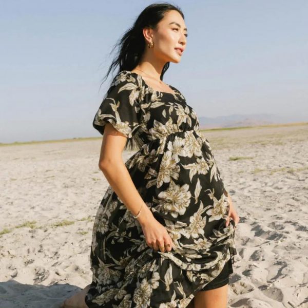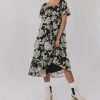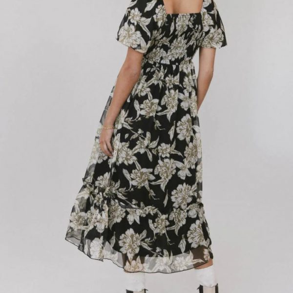 Floral Pattern Square Neckline Short Puff Sleeves Elastic Cuffs, Shoulders Smocked Back One Ruffled Skirt Tier Fully Lined Dress Self, Lining: 100% Polyester Hand Wash Cold, Lay Flat to Dry Model Info Height: 5’8″ Wearing Size: X-Small