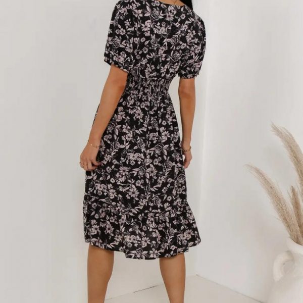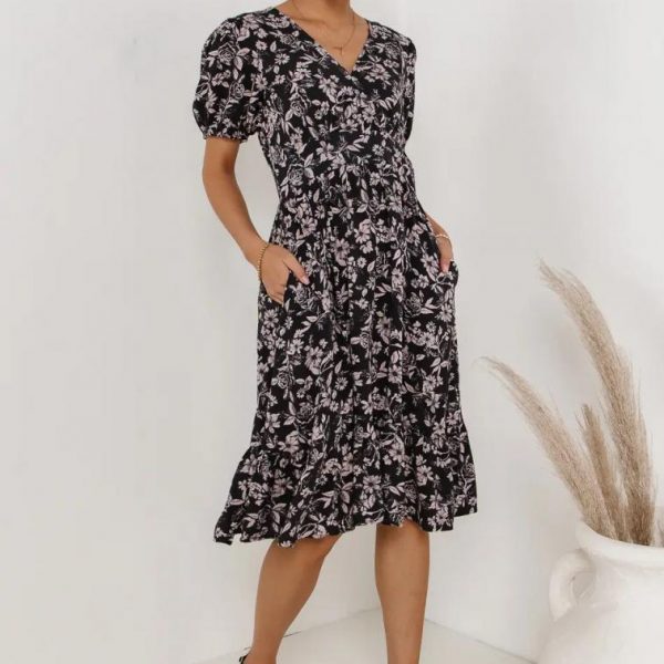 V Neckline Short Sleeves with Elastic Cuffs Back Smocked Waist Two Hand Pockets Not Lined 100% Rayon Hand Wash Cold, Lay Flat to Dry Model Info Height: 5’8″ Wearing Size: Small Measurements: Bust: 34″, Waist: 27″, Length: 40.5″ **For more specific information on the product, please feel free to email us at webteam@ bohme
