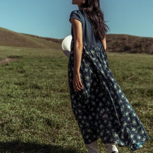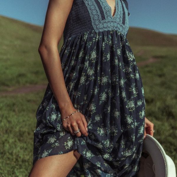 V Neck Neckline Cap Sleeves with Scalloped Lace Trim Lace Overlay Smocked Sides Open Back with Invisible Back Zipper Tie Ribbon Detail Non Stretch Material Lined Self: 97% Cotton, 3% Polyester Lining: 97% Cotton, 3% Polyester Hand Wash Cold, Line Dry Model Info Height: 5’8″ Wearing Size: Small Measurements: Bust: 30″ Length: 49″ **For more specific information on the product, please feel free to email us at webteam@ bohme