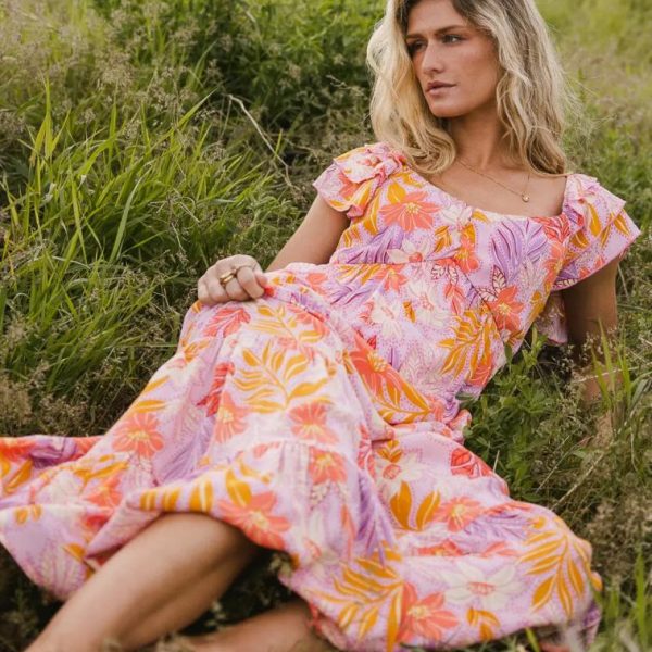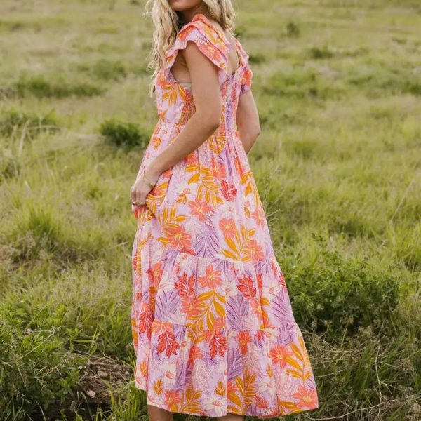 Sweetheart Neckline Short Ruffle Sleeves Elastic Shoulder Cuffs Smocked Back of Bodice Two Hand Pockets Tropical Floral Pattern Three Tiered Skirt Mini Skirt Lining Slightly See Through 100% Rayon Hand Wash Cold, Hang Dry Nothing feels quite as paradisical as the Poppy Tropical Midi Dress. This dress calls for hot temps and sunny skies. Style it with some cute platform sneakers and a hand bag. Model Info Height: 5’7″ Wearing Size: Small