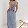 Deep V-Neck Midi Length Adjustable Waist Tie Two Front Pockets Raw Hem 100% Lyocell Hand Wash Cold, Line Dry Model Info Height: 5’7” Wearing Size: Small Measurements: Waist: 38″, Length: 49.5″