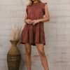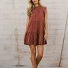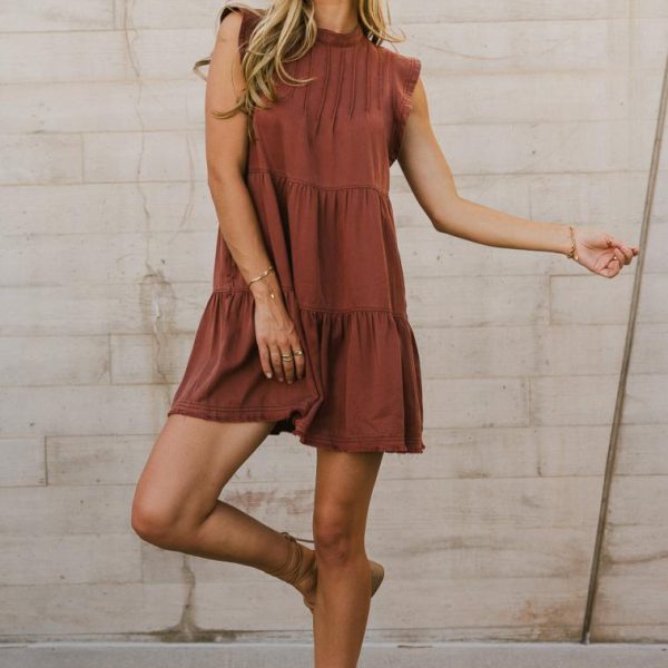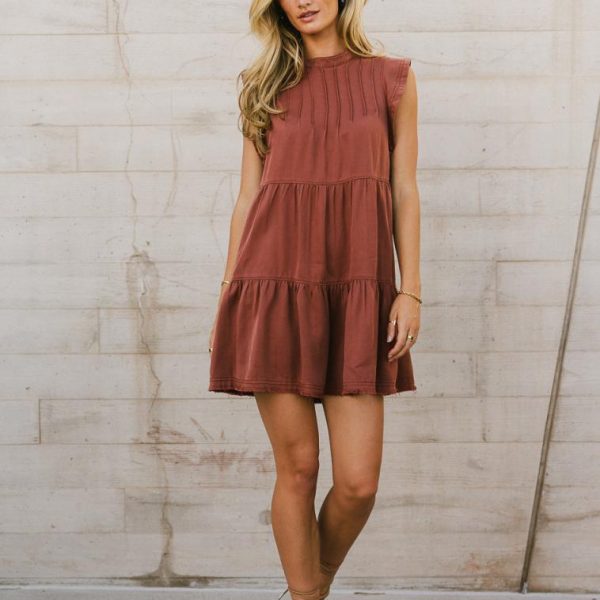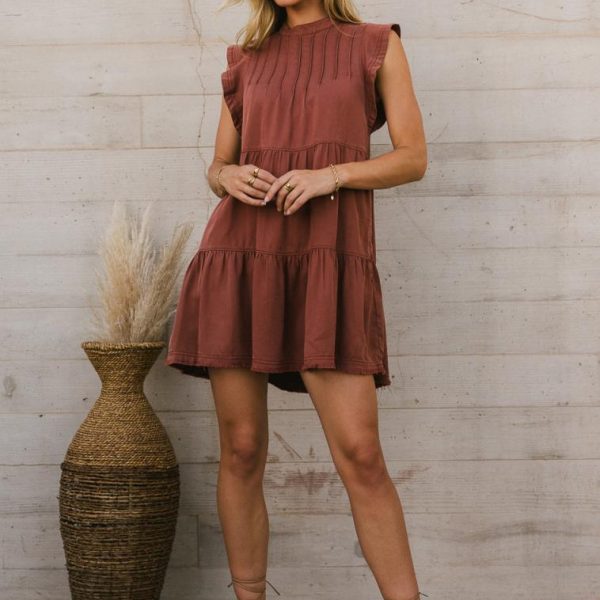 High Crew Neckline Short Flutter Sleeves Pleated Bodice Two Hand Pockets Tiered Skirt Raw Distressed Hem Boxy Fit Two Button Keyhole on Back 100% Tencel Machine Wash Cold, Tumble Dry Low The Regina Pleated Mini Dress in Brick is our new favorite mini dress. This tiered piece is perfect for events of all kinds., whether you’re headed to a wedding, or a lunch date. Pair with a simple tan heel. Model Info Height: 5’7” Wearing Size: X-Small Fit: True To Size