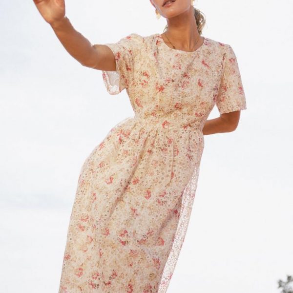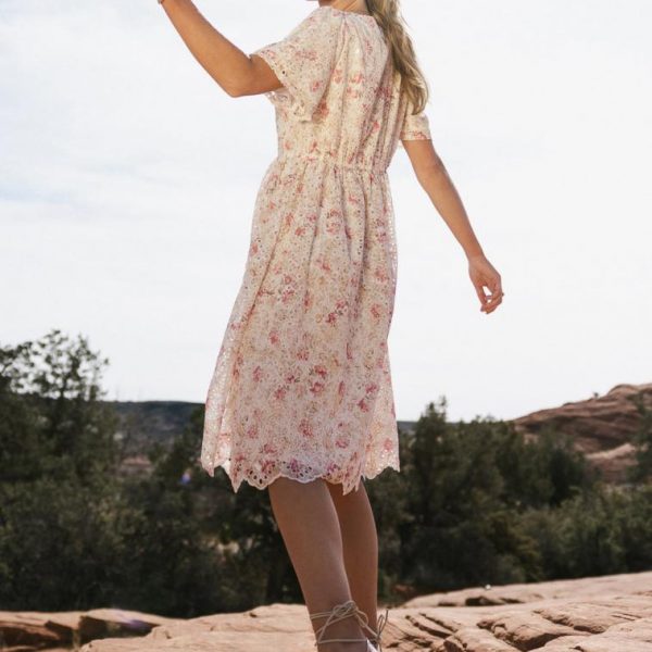 Round Neckline Short Sleeves Eyelet Lace Floral Print Lined 100% Polyester Hand Wash Cold, Line Dry Model Info Height: 5’7” Wearing Size: Small