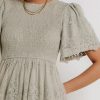 Round Neckline Short Embroidered Mesh Sleeves Smocked Bodice with Embroidered Embroidered Mesh Skirt Back Keyhole Button Closure Sleeve and Skirt Lining Self and Lining: 100% Polyester Hand Wash Cold, Line Dry  Model Info  Height: 5’8″  Wearing Size: Small  Measurements: Bust: 26″, Waist: 24″, Length: 39.5″  **For more specific information on the product, please feel free to email us at webteam@ bohme