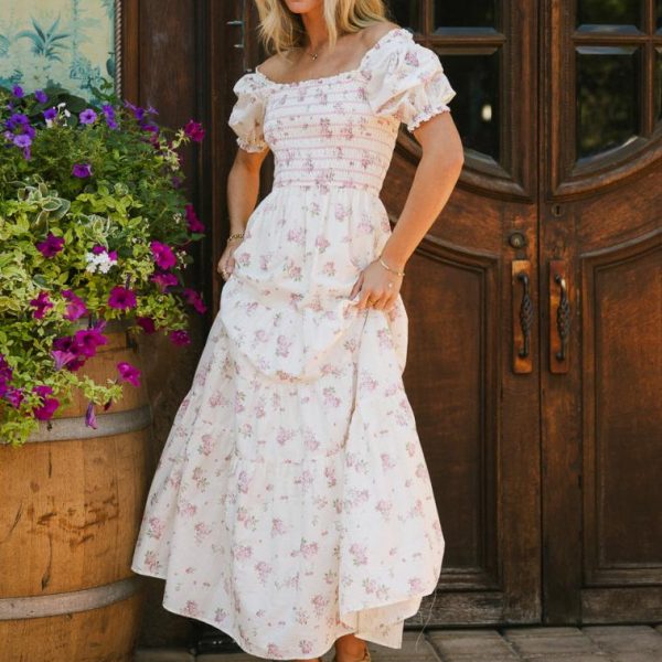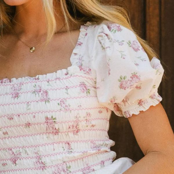 Smocked Bodice Contrast Stitch Ditsy Floral Pattern Ruffled Square Neckline Short Puff Sleeves Elastic Shoulders, Cuffs Four Tiered Skirt Fully Lined, Except Sleeves Self: 100% Cotton Lining: 100% Polyester Hand Wash Cold, Hang Dry Model Info Height: 5’7″ Wearing Size: X-Small