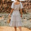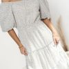 Square Neckline with Ruffle Detail Short Puff Sleeves with Elastic Cuffs and Shoulders Smocked Bodice Two Hand Pockets Tiered Skirt Lined 100% Polyester Hand Wash Cold, Lay Flat to Dry Model Info Height: 5’7″ Wearing Size: Small Measurements: Bust: 31″, Waist: 25″-37″, Length: 44″ **For more specific information on the product, please feel free to email us at webteam@ bohme