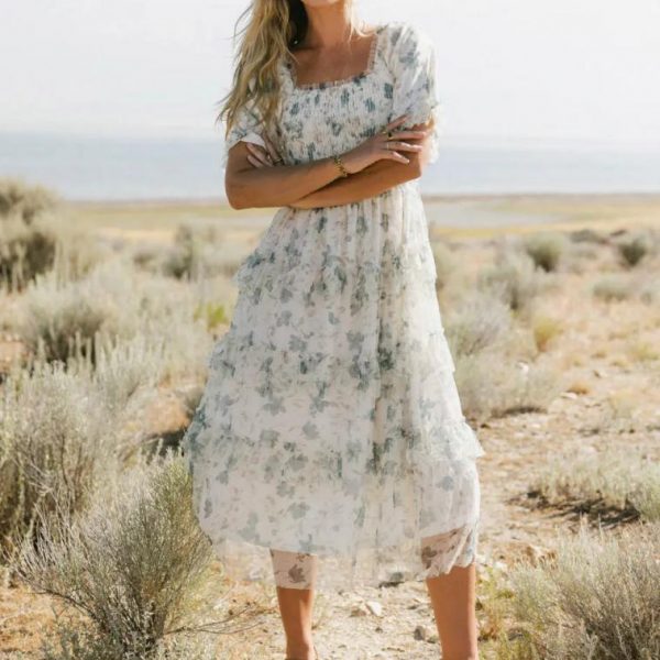 Smocked Bodice Ruffle Short Sleeves Four Tiered Skirt Lined, Slightly See Through Self and Lining: 100% Polyester Hand Wash Cold, Lay Flat to Dry Model Info Height: 5’7″ Wearing Size: Small