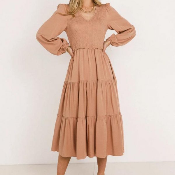Elastic Cuffs  Smocked Bodice, Stretches Lined Skirt Is Non-Stretch Material 100% Polyester Machine Wash Cold on Gentle Cycle, Hang Dry  Our gorgeous Smocked Tiered Midi Dress is a must have for the upcoming season! You’ll be obsessed with the long sleeves, smocked bodice, and the flowy skirt. Perfect for a date night or brunch with the girls! Model Info  Height: 5’7″  Wearing Size: Small