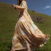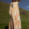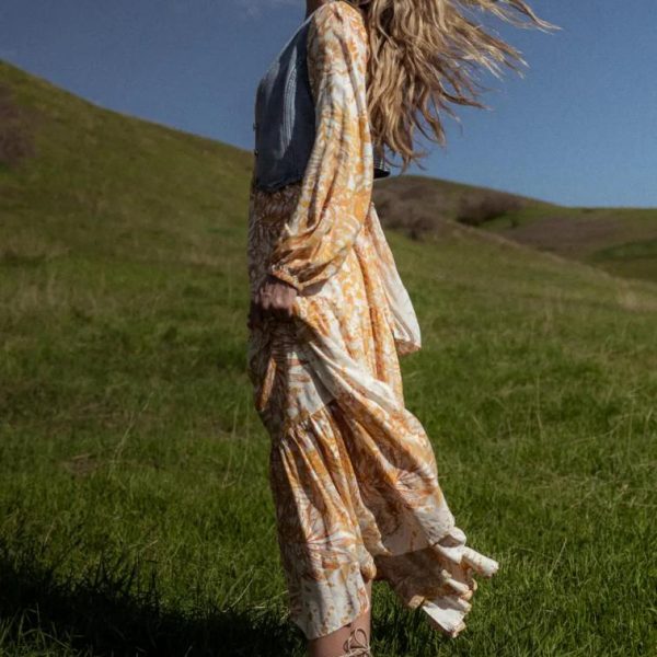 V Neckline Long Sleeves with Elastic Cuff Elastic Waistband on Back Waist Tie Tropical Flora and Fauna Print Tiered Skirt Side Slit Midi Lined Shell: 80% Rayon, 20% Linen Lining: 100% Polyester Looking for a getaway? The Something Tropical Maxi Dress is ready to whisk you away to an island paradise. With flora and fauna print in bright Mustard, this dress is the next best thing. Pair with a pair of sandals, some oversized sunnies and a pi ña colada! Model Info Height: 5’7″ Wearing Size: Small