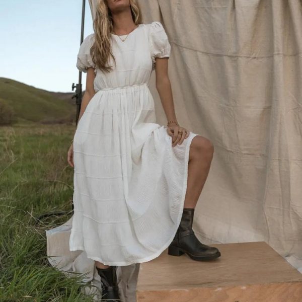 Rounded Neckline Short Puff Sleeves with Elastic Cuff Gathered Bodice and Skirt Elastic Waist Stretchy Material Lined Except for the Sleeves Back Keyhole with Button Closure Repetitive Gathered Pleats 100% Polyester Hand Wash Cold, Hang Dry  The Tenner Midi Dress is a real show stopper. The gathered pleating provides a simple, yet elegant look perfect for any formal occasion. Grab your favorite strappy sandals and a clutch to complete your outfit. Model Info  Height: 5’8″  Wearing Size: Small  Measurements: Bust: 34″, Waist: 28″, Length: 48″  **For more specific information on the product, please feel free to email us at webteam@ bohme