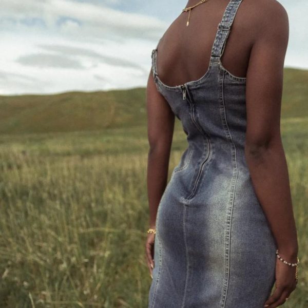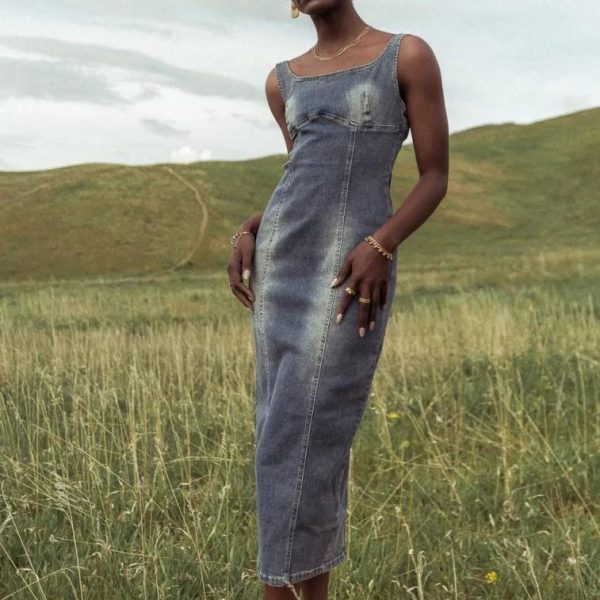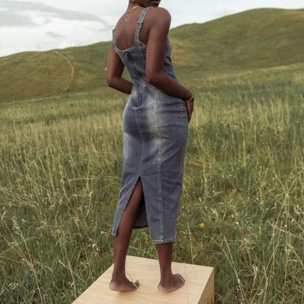 Round Neckline Adjustable Shoulder Straps Back Zipper Closure Back Slit Seam Paneling Detail Bust Darts Faded Stretchy Material 70% Cotton; 28% Polyester; 2% Spandex Hand Wash Cold, Line Dry Looking for your new favorite dress? The Valentini Denim Midi Dress has nothing short of star quality. This tight fitting dress is flattering with its distressed . Grab a leather bomber and some sneakers to finish the look. Model Info Height: 5’5″ Wearing Size: Small