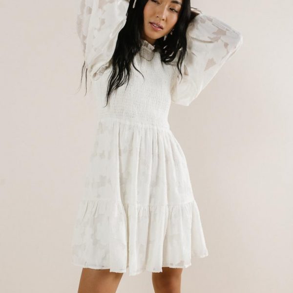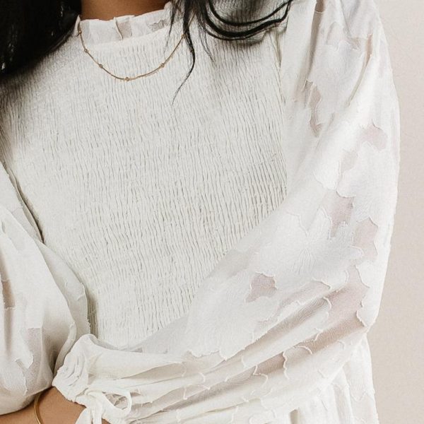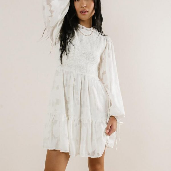 Round Neckline with Ruffle Detail Long Puff Sleeves with Elastic Cuffs and Tie Detail Smocked Bodice Tiered Skirt Textured Jacquard Detail back Keyhole Closure 100% Polyester Hand Wash Cold, Line Dry Model Info Height: 5’8″ Wearing Size: Small Measurements: Bust: 30″, Waist: 27″-30″, Length: 34″ **For more specific information on the product, please feel free to email us at webteam@ bohme