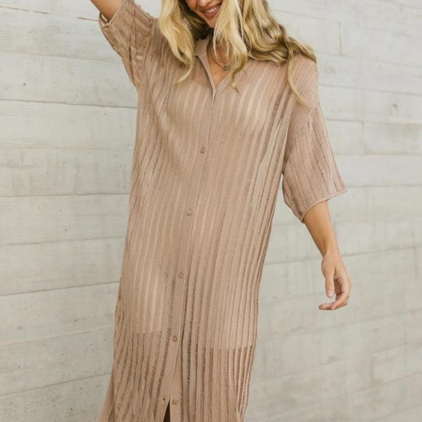 Sheer Material Collared Neckline Six Front Button Closure Short Sleeves Rolled Hems Woven Striped Pattern Slight Stretch Material 80% Viscose, 20% Nylon Hand Wash Cold, Hang Dry One piece sold separately  Dress Is Unlined and See Through  Model Info Height: 5’7″ Wearing Size: Small