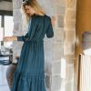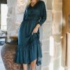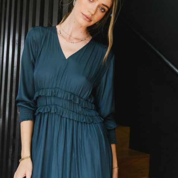 V Neckline Elastic Waist with Ruffle Detailing 3/4 Sleeves with Elastic Cuffs Midi Length with Ruffle Detailing on the Skirt Fully Lined 100% Polyester Machine Wash Cold, Hang or Tumble Dry Low You’ll look and feel beautiful in our Willa Sleeved Ruffle Dress! We are in love with the lightweight flowy material. This dress was made for date nights and for our bridesmaids. Model Info Height: 5’7″ Wearing Size: X-Small