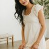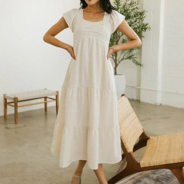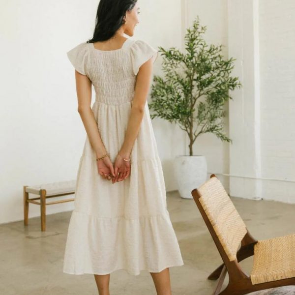 Sweetheart Neckline Short Flutter Sleeves Gathered Bust Detail Three Tiered Skirt Two Hand Pockets Textured, Non Stretch Material Lined Skirt, Unlined Bodice Self, Lining: 100% Polyester Hand Wash Cold, Lay Flat to Dry  Model Info Height: 5’8″ Wearing Size: X-Small