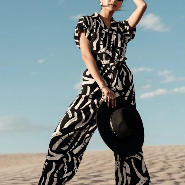 Collared V Neckline Seven Button Front Closure Two Front Pockets Short Rolled Sleeves Waist Tie with Belt Loops Wide Leg Fit Slightly See Through 83% Rayon, 17% Nylon Hand Wash Cold, Hang Dry  The Luca Abstract Print Jumpsuit is turning heads this summer, and your closet wants a piece of the action! This jumpsuit can be a casual outfit with a pair of sneakers or a formal ensemble with a pair of heels. Model Info Height: 5’8″ Wearing Size: X-Small