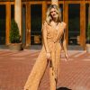 Deep V Neckline Tank Shoulder Straps Five Button Bodice Closure Two Hand Pockets Belt Loops and Waist Tie Wide Leg Fit Non Stretch Woven Material Slightly See Through, Lined Breast Shell: 80% Polyester, 20% Cotton Lining: 100% Rayon Model Info Height: 5’7” Wearing Size: Small