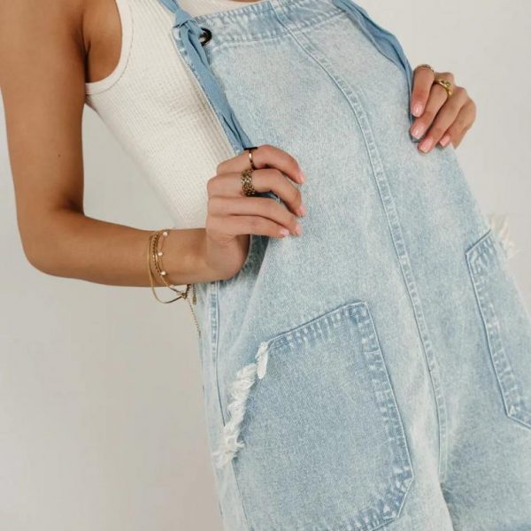 Denim Short Overalls 1.5″ Adjustable Straps  Two Front Pockets Symmetrical Seam Panel Detail Distressed Seam Detail 100% Cotton  Machine Wash Cold, Line Dry   This romper is a must-have for your summer. Wear it over a blouse for a day out with friends, or over a Henley top for a comfy day in.  Model Info  Height: 5’8″  Wearing Size: Small