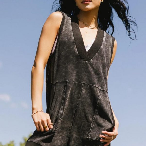 Plunge V Neckline Mineral Wash Tank Style Straps Two Rectangular Patch Pockets Tapered Leg with Elastic Cuff Contrast Ribbed Hem Trim Stretchy Material 85% Cotton, 33% Cotton, 2% Spandex Hand Wash Cold, Hang or Flat Dry  *Mineral wash garments are uniquely dyed and may present variations. The Yvette Jumpsuit in Black is our latest loungewear favorite. This comfy one piece can be dressed up for days out, or keep you cozy on days in. Pair with your favorite slides and tackle your at-home to-do list in style. Model Info Height: 5’7″ Wearing Size: Small