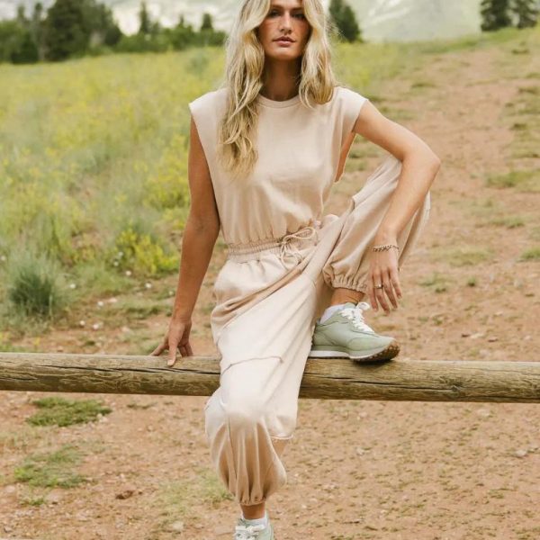 Ribbed Crew Neckline Elastic Waist with Tie Raw Hem Muscle Tank Sleeve Two Hand Pockets Open Back and Snap Button Elastic Cuffed Ankles Raw Seam Stretch Knit Material 100% Cotton Dry Clean Only  *Mineral wash garments are uniquely dyed and may present variations. Model Info Height: 5’7″ Wearing Size: X-Small