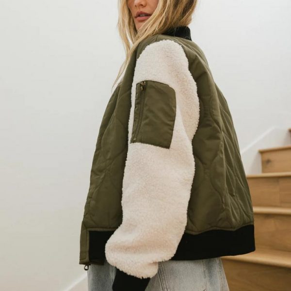 Long Sherpa Sleeves Left Zipper Pocket on Sleeve Quilted Button and Zipper Closure Two Hand Pockets 100% Polyester Machine Wash Cold, Line Dry Model Info Height: 5’7″ Wearing Size: Small