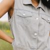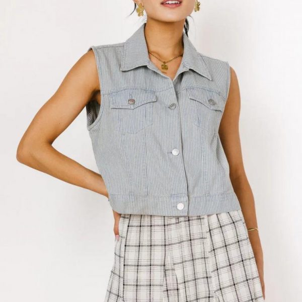 Collared Neckline Striped Pattern Four Functional Buttons Two Button Flap Chest Pockets Seam Panel Cropped Fit 95% Cotton, 5% Polyester Hand Wash cold, Hang Dry Grab a pair of cargos, a basic tee and your favorite sneakers to style with the Daphne Striped Denim Vest. This layering piece is sure to be a fan favorite for trips to the mall, or walks around the park. Model Info Height: 5’8″ Wearing size: Small