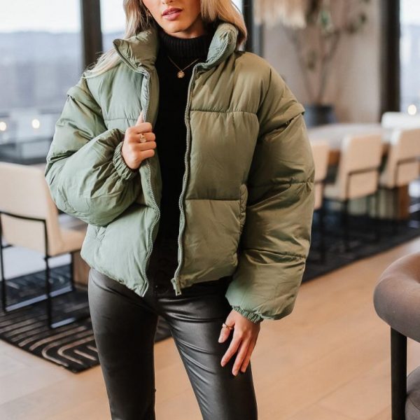 Mock Neckline Long Sleeves, Can Detach Puffer Two Hand Pockets Front Zipper Closure Lined Self: 75% Polyester, 25% Nylon; Filler & Lining: 100% Polyester Hand Wash Cold, Dry Flat Model Info Height: 5’6” Wearing Size: Small
