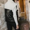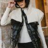 Mock Neckline Sleeveless Faux Sherpa and Vegan Leather Material Two Hand Pockets Snap Button Closure Puffer Vest Lined Self: 55% Viscose, 45% PU; Lining: 97% Polyester, 3% Spandex; Contrast: 100% Polyester Hand Wash Cold, Line Dry  Model Info  Height: 5’7″  Wearing Size: Small