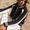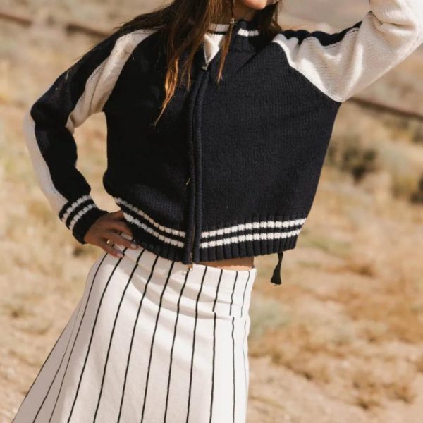 This is a Pre-Order Item, estimated ship date is 9/6/2024. For more information on preorders, click here  Mock Neckline Striped Ribbed Trim Two Way Zipper Long Sleeves with Cuffs Contrast Sleeves 100% Polyester Hand Wash Cold, Flat Dry  Model Info Height: 5’8″ Wearing Size: Small Small Measurements: Bust: 42″, Length: 21″