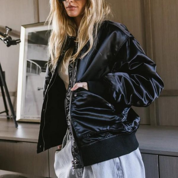 Snap Button and Zipper Closure Long Sleeves Non Stretch Satin Material Two Front Pockets with Snap Button Closure Self: 100% Nylon; Lining: 100% Polyester; Contrast: 95% Polyester, 5% Spandex Hand Wash Cold, Line Dry Model Info Height: 5’7″ Wearing Size: Small