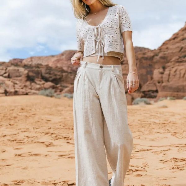 High Rise Back Elastic Waist Button and Zipper Closure Wide Leg Textured Woven 55% Cotton, 45% Tencel Hand Wash Cold, Hang Dry Model Info Height: 5’7” Wearing Size: Small