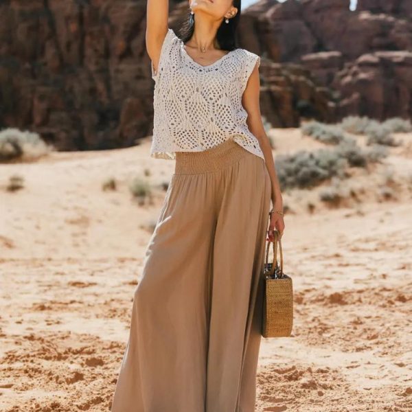 Wide Leg Pants  Smocked Waistband High-Rise Slightly See-Through Not Lined 100% Rayon Machine Wash Cold, Flat Dry  Model Info: Height: 5’8″ Wearing Size: Small  Measurements: Waist: 23″ – 28″, Rise: 12″, Inseam: 28″