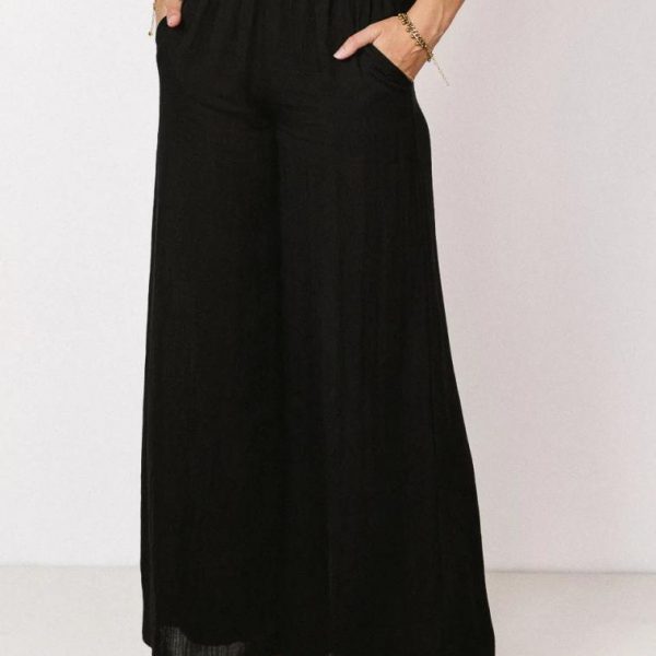 Elastic Waist Two Hand Pockets Wide Leg Non-Stretch Material Slightly See Through 95% Rayon, 5% Nylon Machine Wash Cold, Flat Dry Matching Pieces Sold Separately Classic black flowy pants are hard to beat and the Maren Pants in Black are no different. Match these pants with anything from a floral blouse to a simple tank, or its matching top. Model Info Height: 5’7″ Wearing Size: Small